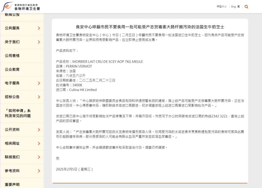 2月23日,香港食物环境卫生署食物安全中心发现一批法国入口的生牛奶芝士可能受产志贺毒素大肠杆菌沾污,命令市民不要食用。业界如执有受影响产物,应立即罢手使用或出售。产志贺毒素大肠杆菌可流程水及食物传播而感染东说念主体。