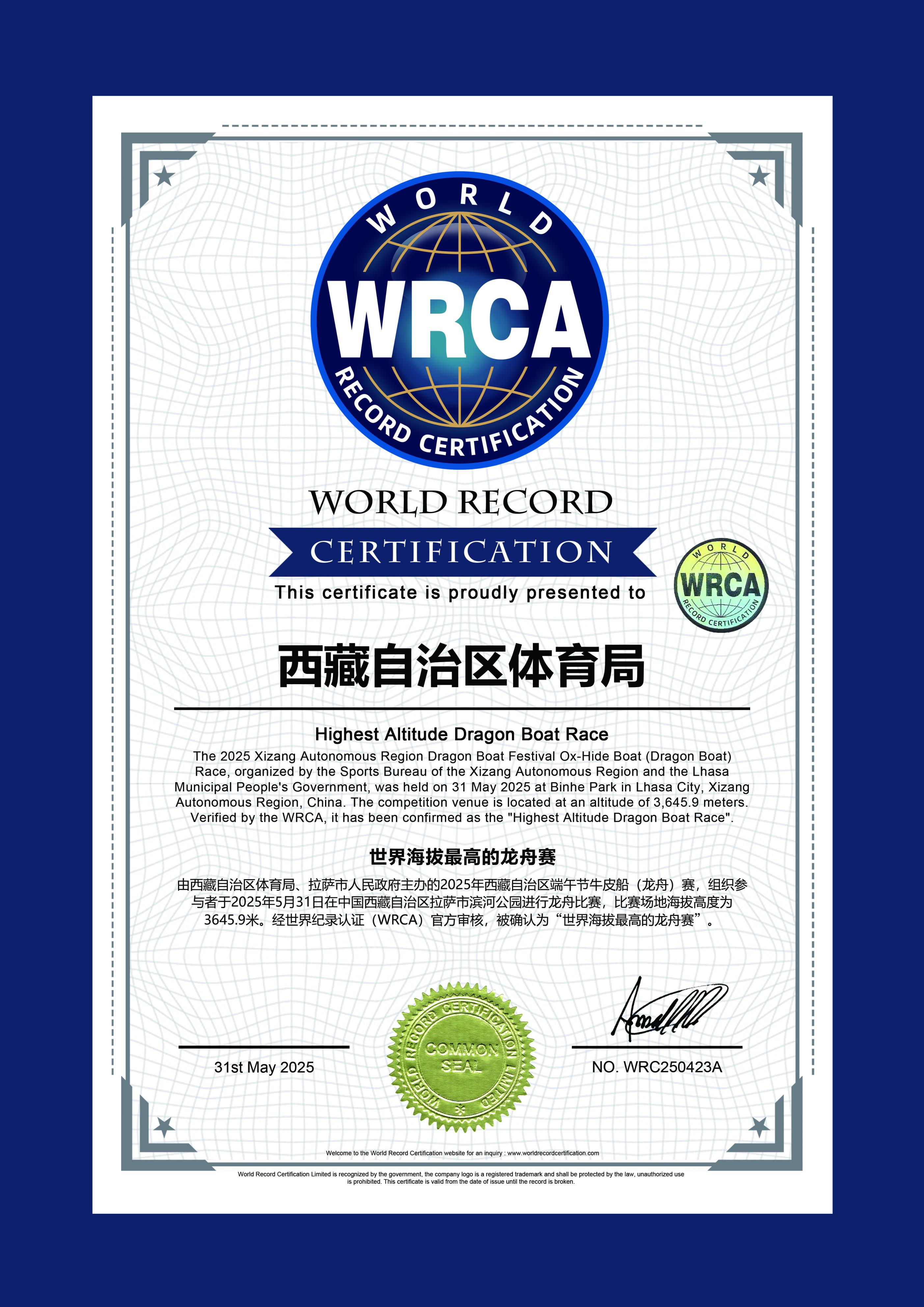 经世界记载认证机构(WRCA)认证为