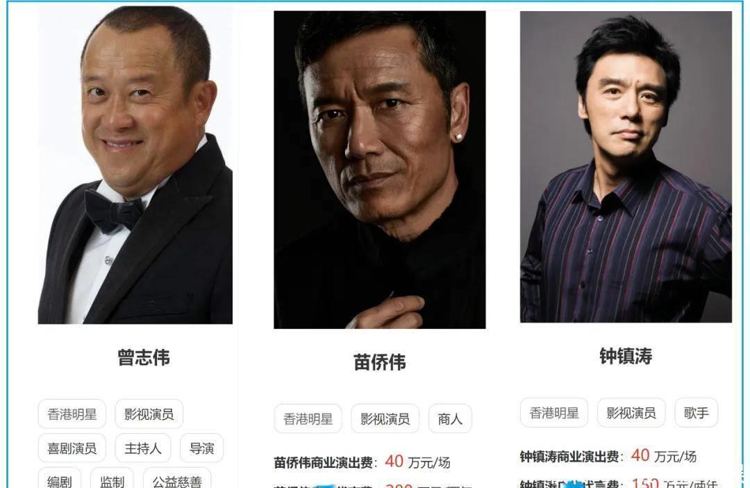 这三位天然是老港星了,但出场费齐还很高,仍达到二线明星的水平。令东说念主没念念到的是,出场费最高的反而是不需要唱歌的曾志伟,苗侨伟和钟镇涛则旗饱读相称。