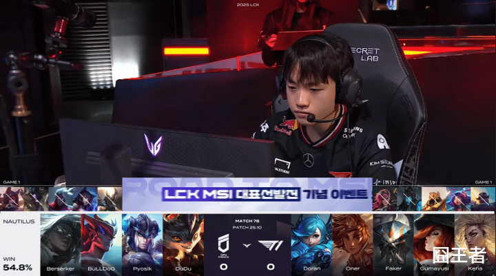 第一局比赛,D NF蓝色方,禁用:潘森、阿狸、韦鲁斯、毒头、霞,采取:DuDu兰博、Pyosik瑟庄妮、BuLLDoG永恩、Berserker赛娜、Andil泰坦;T 1红色方,禁用:蔚、卡莉斯塔、沙皇、妮蔻、布隆,采取:Doran格温、Oner蝎子、Faker岩雀、Gumayusi女枪、Keria芮尔