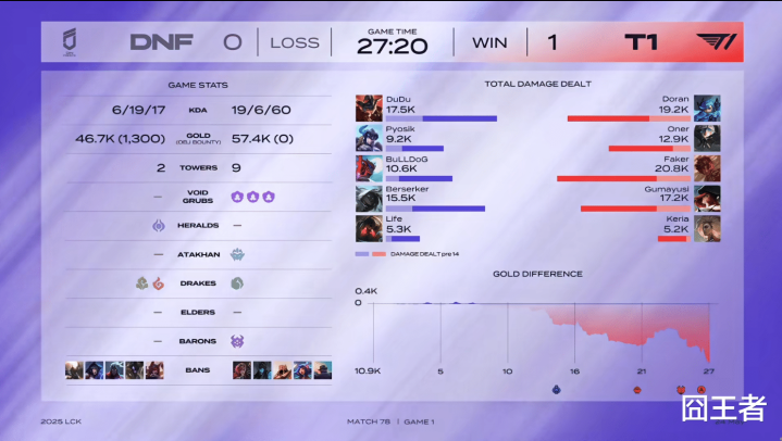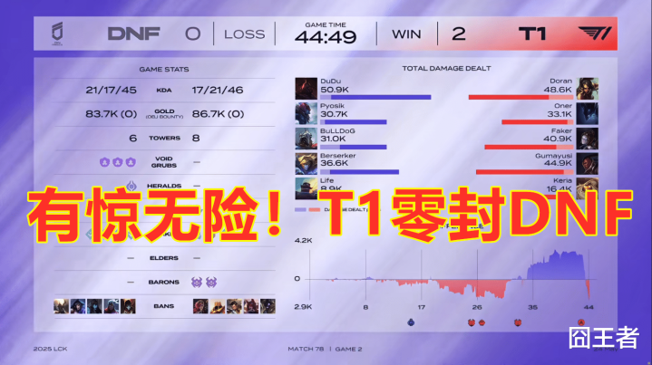 遵循第二局比赛,全王人提现了,什么叫翻中翻,先是T1跳动,其后在比赛后期,DNF跳动近5000块,正觉得要第三把的手艺,T1倏得发力,赢下比赛,这你敢信?比赛第25分钟掌握,Keria巴德涌现Q钉墙Berserker伊泽瑞尔,T1击杀DNF双C后拿下大龙;比赛第34分钟掌握,DNF抱团打大龙被Keria巴德抢掉,但Gumayusi卢锡安被塞恩单杀,DNF反手打出0换3;比赛第37分钟掌握,两队爆发小龙团。Gumayusi卢锡安奋力换掉两东说念主,但DNF先后打出2换5,然则Oner梦魇抢到小龙打断了DNF龙魂;最终比赛第44分49秒,DNF拿到电龙魂,但Gumayusi卢锡安绕后秒掉Berserker伊泽瑞尔,T1打出0换5翻盘班师。