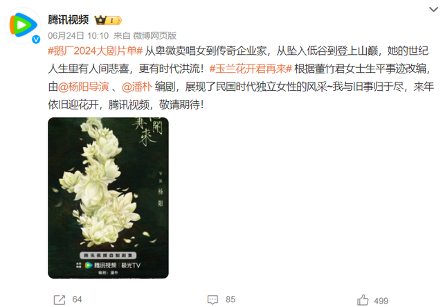 《玉兰花开君再来》故事的女主是阿媛,她因为家庭空乏,被卖到长三楼作念女乐,在机缘恰巧之下,她救下一个夏之时,对方带她开启新鲜的东谈主生,而她也有一个新名字“董竹君”。