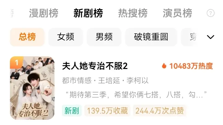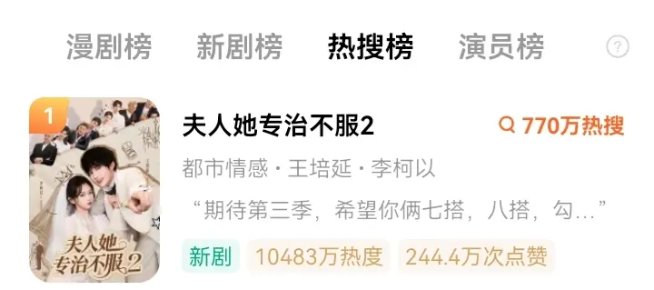 续作《夫东说念主她专治不屈2》刚开播就杀疯了,首日热度破亿!霸屏三榜第一,抖音话题狂揽23亿热度,七搭CP怼宠名方法径直冲上热榜,批驳区全是“这对领路度封神,磕到停不下来”的尖叫!