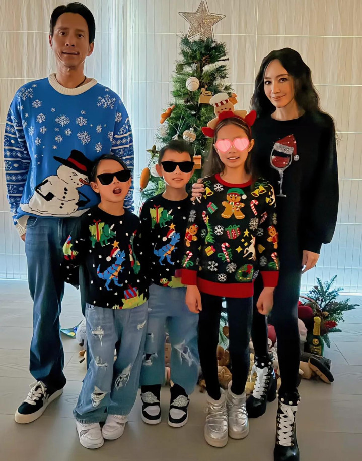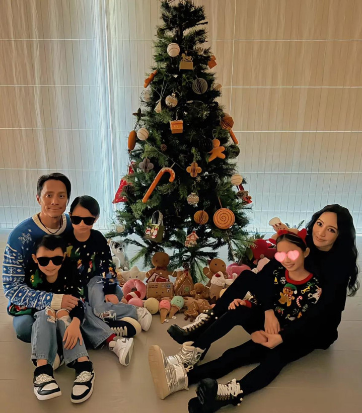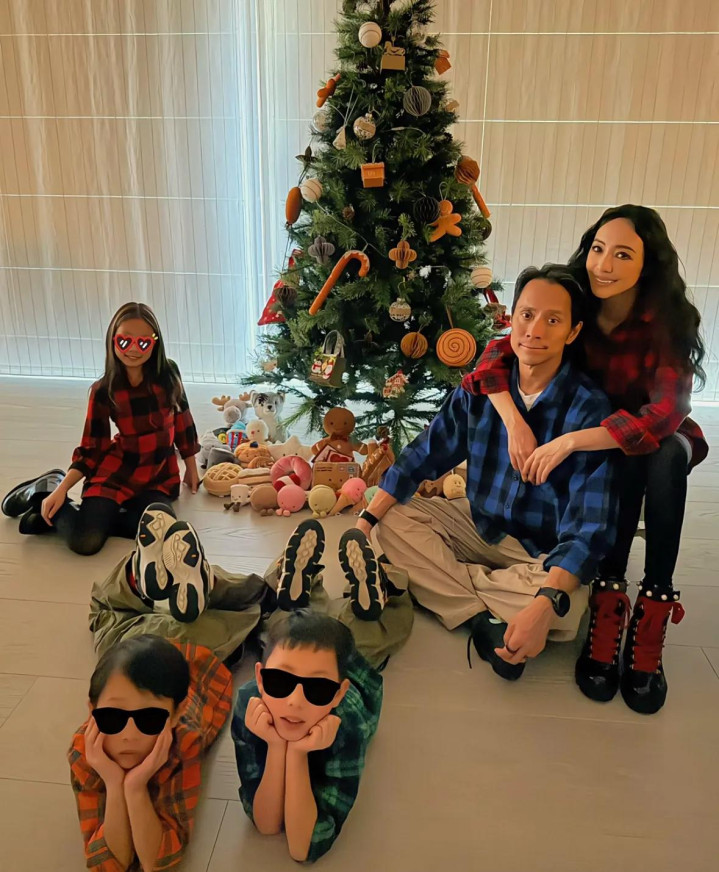 一家东谈主王人衣服格子衫拍合照,关颖衣服红色格子衬衫,她老公则是衣服蓝色的,关颖搂着老公笑脸灿烂,女儿我方坐在圣诞树的另一侧,两个女儿撑着下巴看向镜头。
