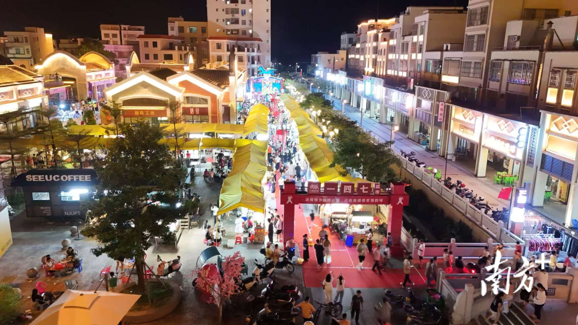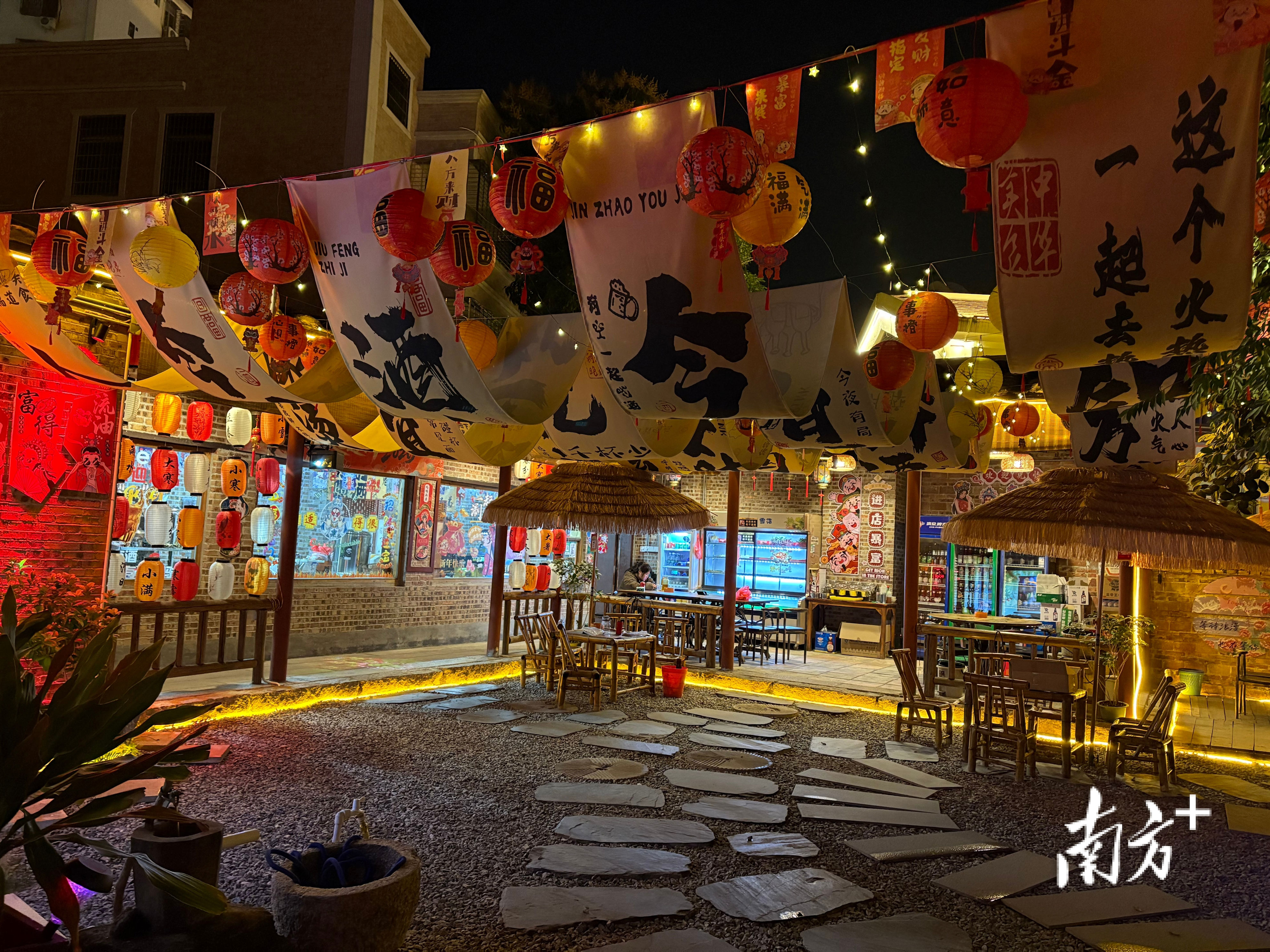 傍晚18时30分,天色昏千里。茂名市茂南区金塘镇福城路上,彩色串灯次第亮起,油城墟的夜晚开动了。