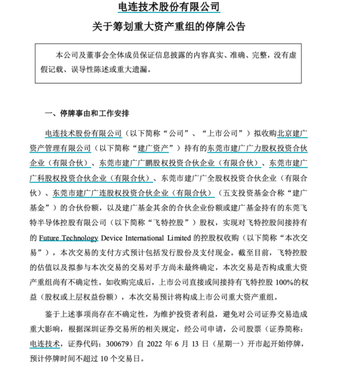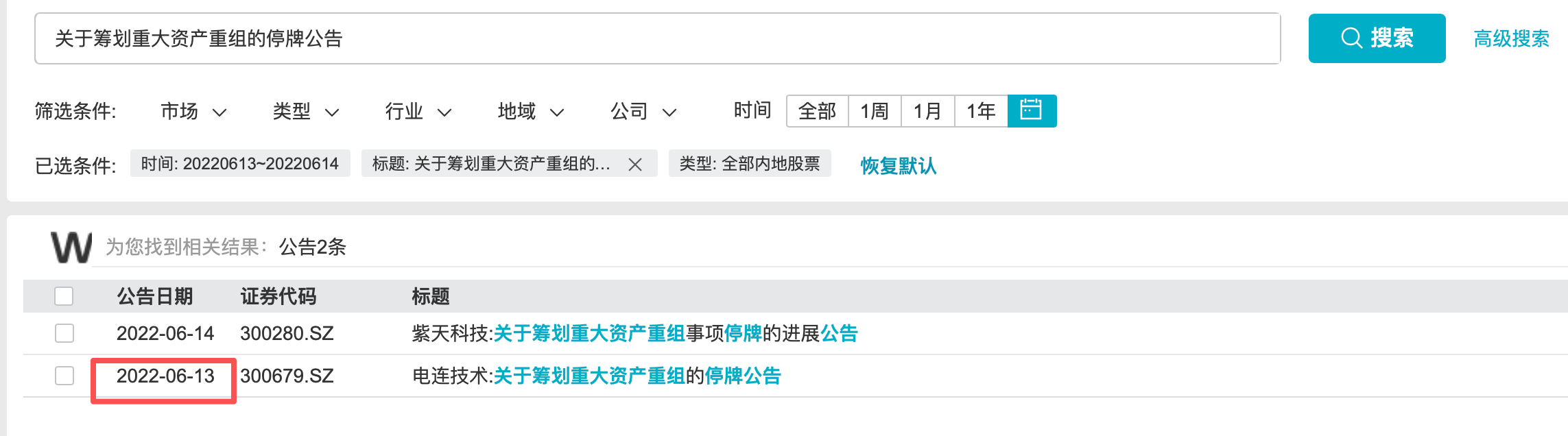 记者查询发现,根据Wind和巨潮资讯信息,2022年6月13日当日,阛阓仅有电连技艺(300679.SZ)发布《对于筹谋要紧钞票重组的停牌公告》。