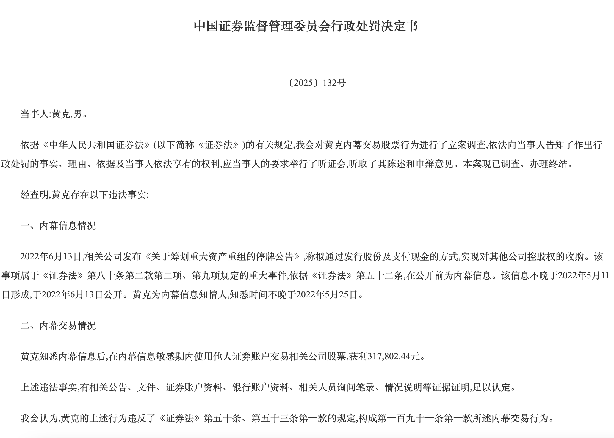 经查明,黄克瞻念察内幕信息后,在内幕信息明锐期内使用他东说念主证券账户交往相关公司股票,赢利31.78万元。根据当事东说念主行恶算作的事实、性质、情节与社会危害进程,证监会决定:充公黄克行恶所得31.78万元,并处以150万元罚金。