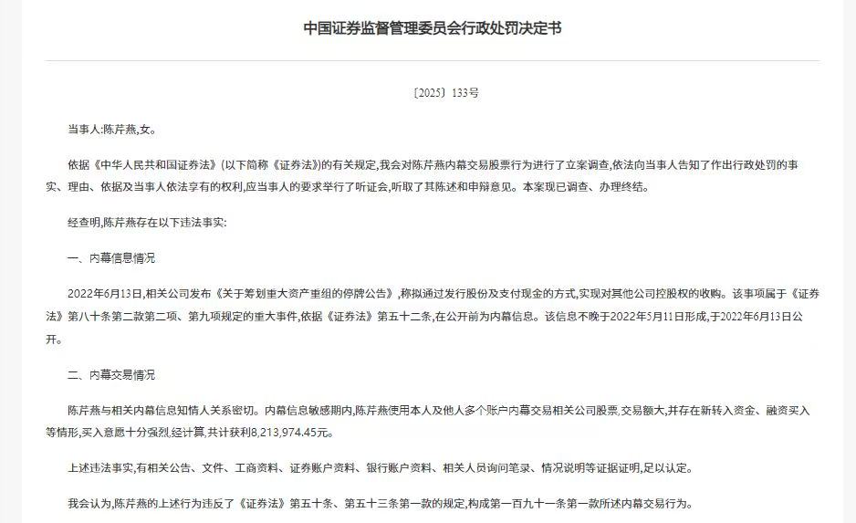 其中,陈芹燕存在以下行恶事实:经查明,2022年6月13日,相关公司发布《对于筹谋要紧钞票重组的停牌公告》,称拟通过刊行股份及支付现款的步地,已矣对其他公司控股权的收购。陈芹燕与相关内幕信息知情东说念主关系密切。内幕信息明锐期内,陈芹燕使用本东说念主及他东说念主多个账户内幕交往相关公司股票,交往额大,并存在新转入资金、融资买入等情形,买入意愿尽头热烈,经瞎想,共计赢利821.4万元。
