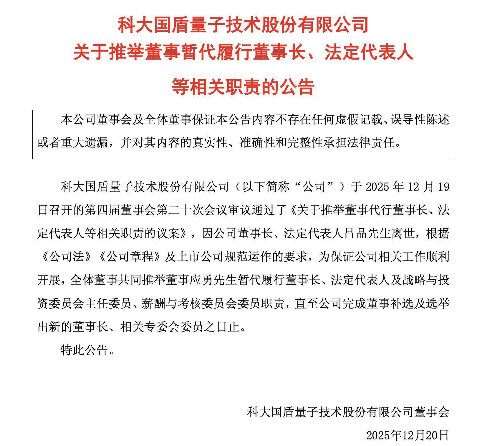 12月19日晚间,国盾量子发布公告称,因公司董事长、法定代表东谈主吕品先生离世,整体董事共同推举董事应勇先生暂代实行董事长、法定代表东谈主及策略与投资委员会主任委员、薪酬与窥伺委员会委员责任,直至公司完成董事补选及选举出新的董事长、联系专委会委员之日止。
