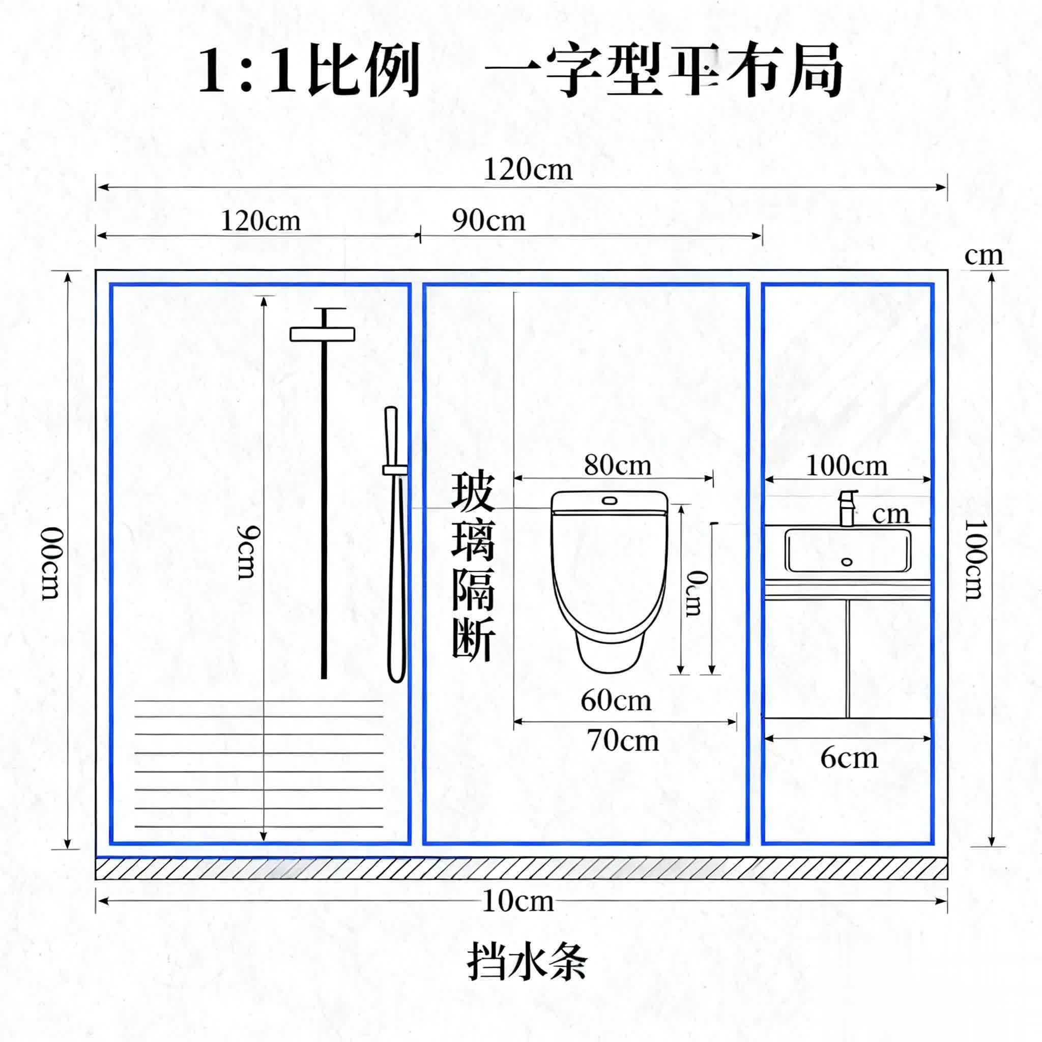 • 基础版:一字型布局——淋浴区、马桶区、洗漱区挨次排开,用玻璃圮绝违背水汽。