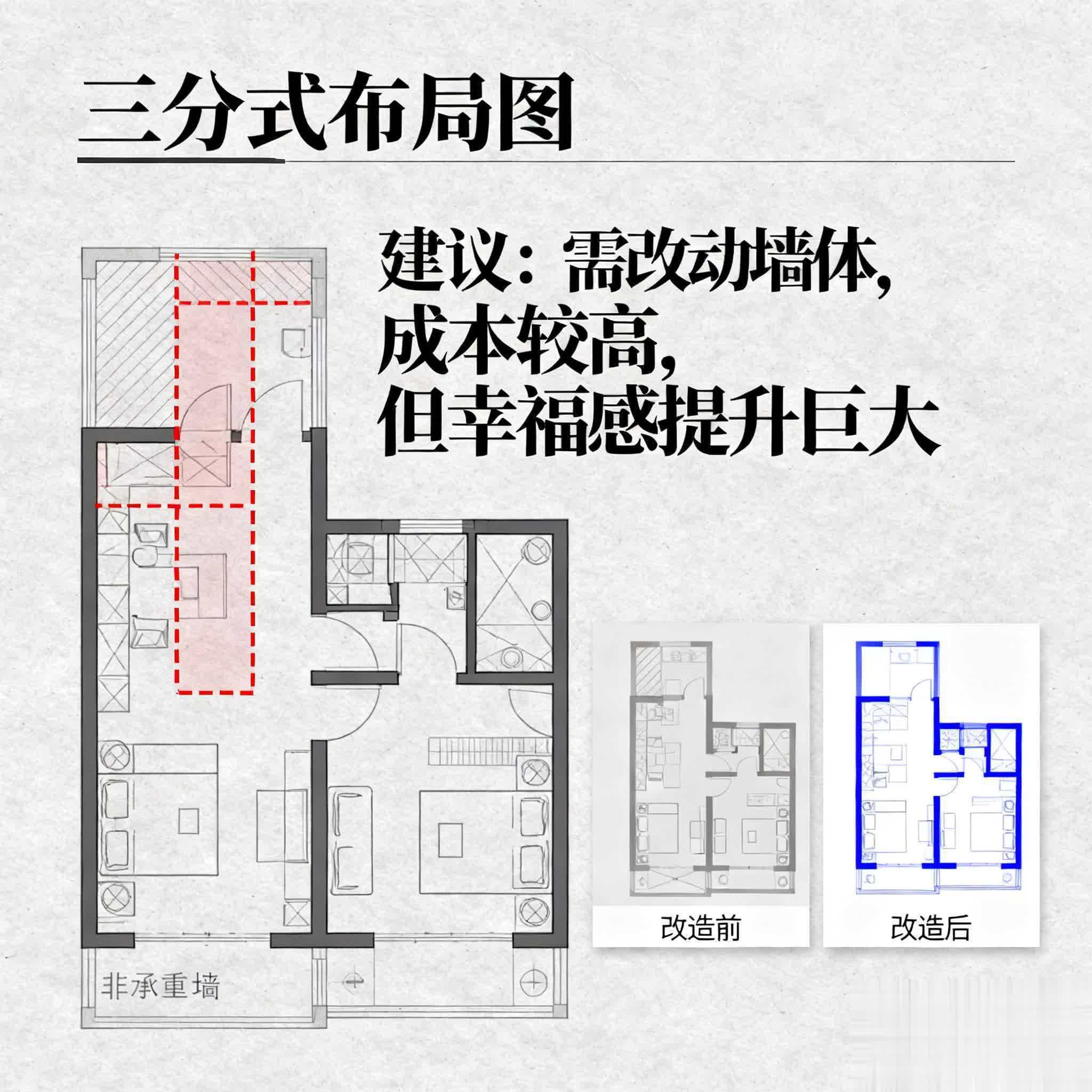 • 豪华版:双动线布局——洗漱台外置并设两个进口,变成回字形高效动线,合适多东谈主家庭。