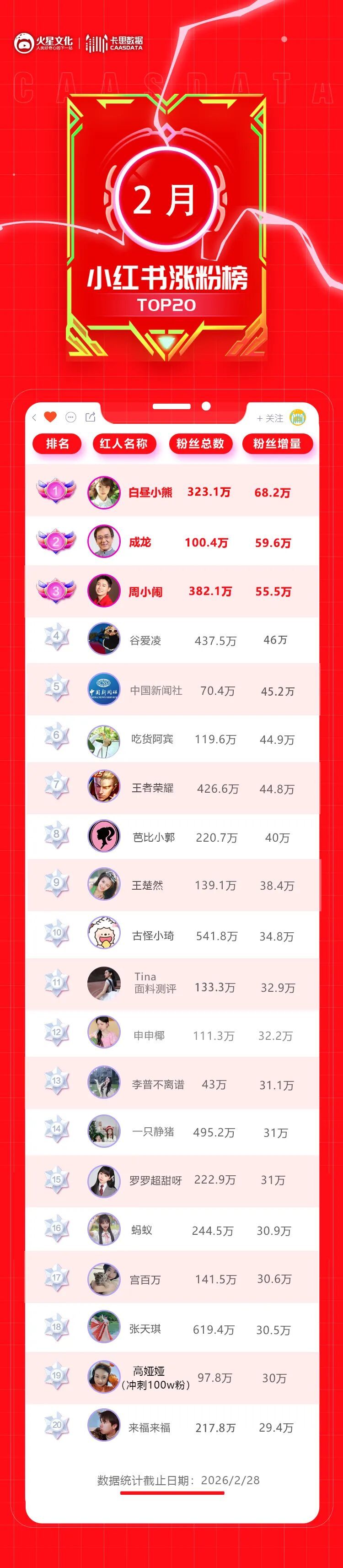 春节往时,小红书的内容生态发生了怎么的变化?咱们总共来看2月涨粉榜: