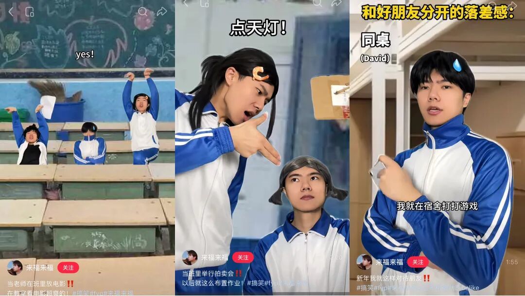 比如,切入校园搞笑赛说念的@来福来福,一东说念主塑造了由Bob、来福、同桌David构成的“铁三角”主角团、课代表Judy、英语敦朴Miss杨等经典碎裂,并为他们各自赋予了独具追想点的东说念主设:同桌身负异能,能干五行八卦和隐身术,总有收不完的手机;“颖异差生”来福,在濒临烂摊子时会发出标记性的“巴巴比卜”音效;Miss杨严格但心软,正常手捏教案给以学生“看法杀”。