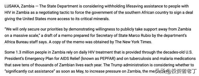 据《纽约时报》报谈,好意思国国务院非洲事务局为国务卿卢比奥准备了一份里面备忘录草案,用PEPFAR卫生援手作念筹码,疏浚赞比亚向好意思国企业怒放铜、钴、锂等要津矿产的开采准入。